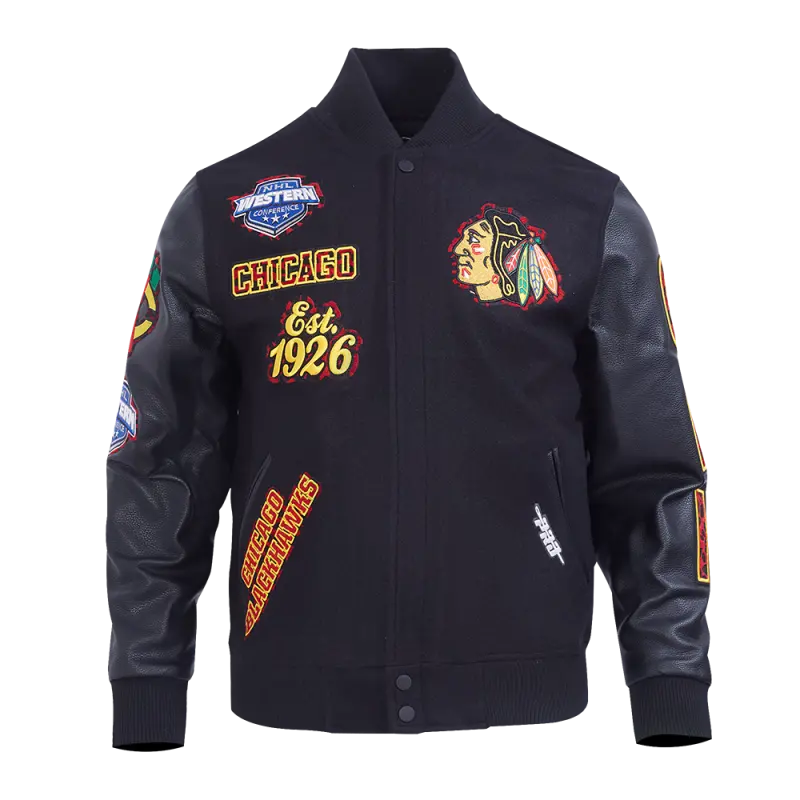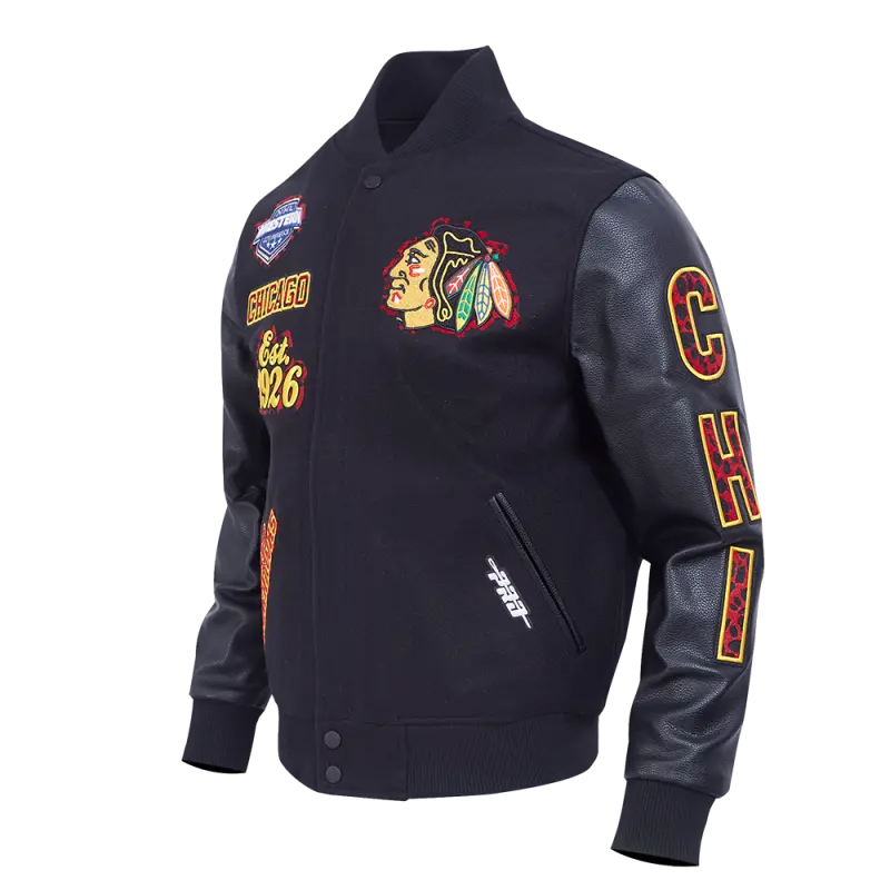 NHL CHICAGO BLACKHAWKS ANIMAL PRINT MEN’S WOOL VARSITY JACKET (JET BLACK)