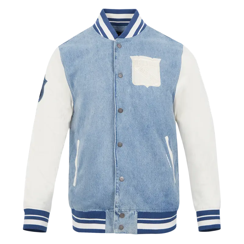 NHL NEW YORK RANGERS VARSITY BLUES MEN’S DENIM VARSITY JACKET (DENIM\/LINEN)