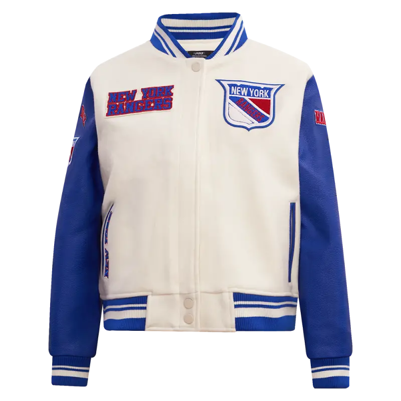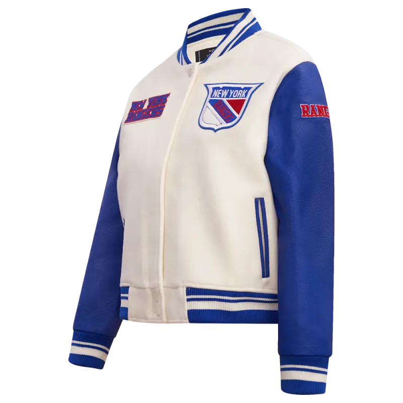 NHL NEW YORK RANGERS RETRO CLASSIC WOMEN’S RIB WOOL VARSITY JACKET (EGGSHELL\/ROYAL BLUE)