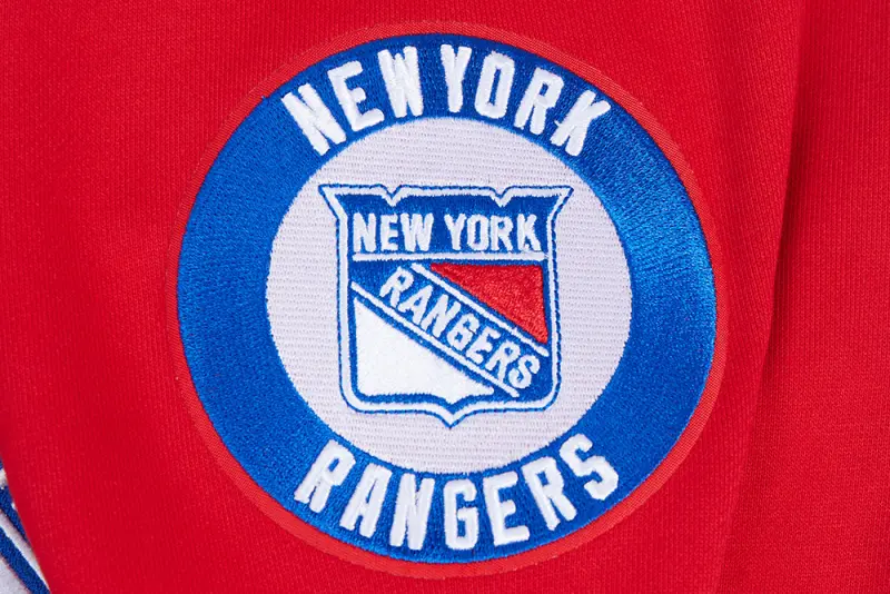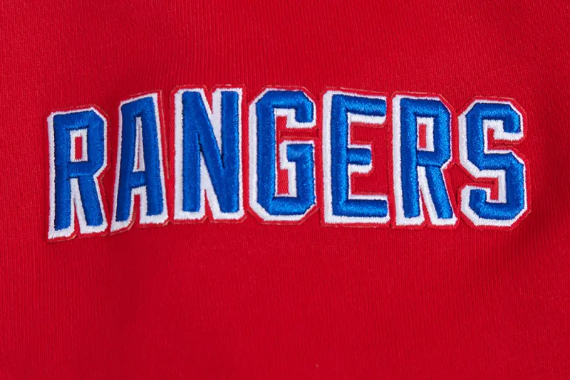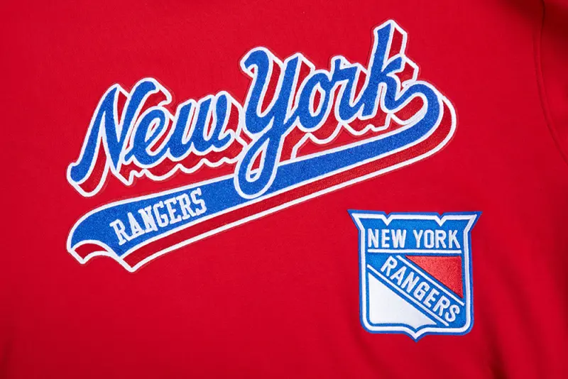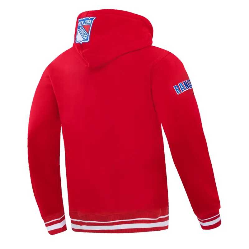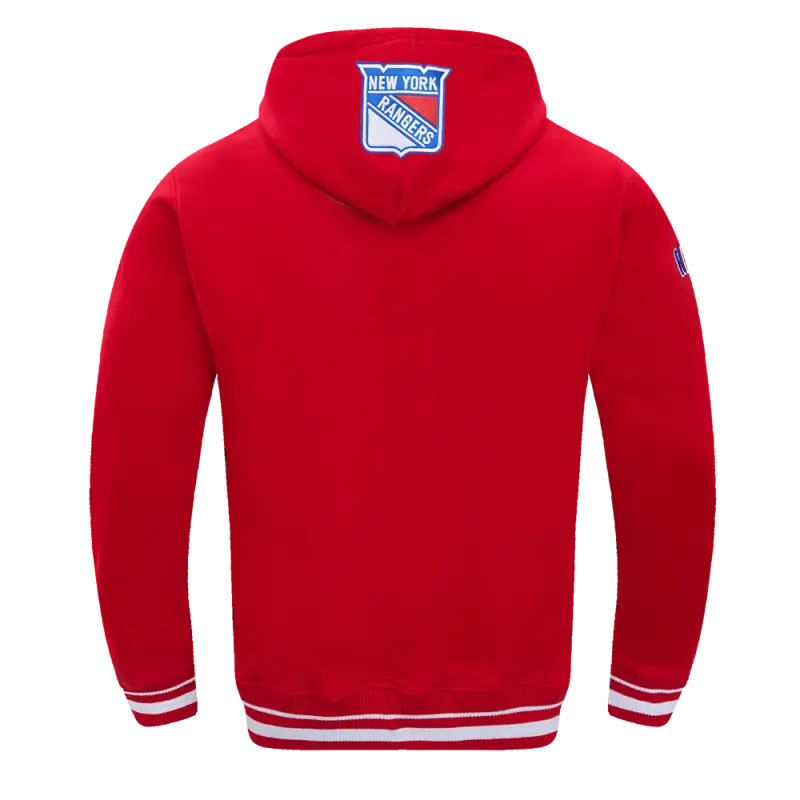NHL NEW YORK RANGERS SCRIPT TAIL MEN’S RIB FLEECE PULLOVER HOODIE (RED)