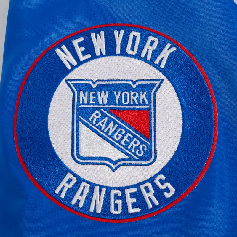 NHL NEW YORK RANGERS SCRIPT TAIL MEN’S SATIN JACKET (ROYAL BLUE\/RED)
